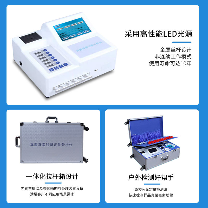 深芬儀器CSY-YG701真菌毒素快速測定儀能夠快速定量檢測糧食、飼料、谷物、食用油、調(diào)味品等食品中T2毒素、嘔吐毒素、赭曲霉毒素、伏馬毒素、玉米赤霉烯酮,適用于糧油監(jiān)測中心、糧油飼料生產(chǎn)加工、食品加工貿(mào)易、畜禽養(yǎng)殖戶自查、質(zhì)監(jiān)部門用于市場快速篩查等,能夠快速準確定量檢測出食品中的真菌毒素含量,杜絕真菌毒素超標食物流入市場。